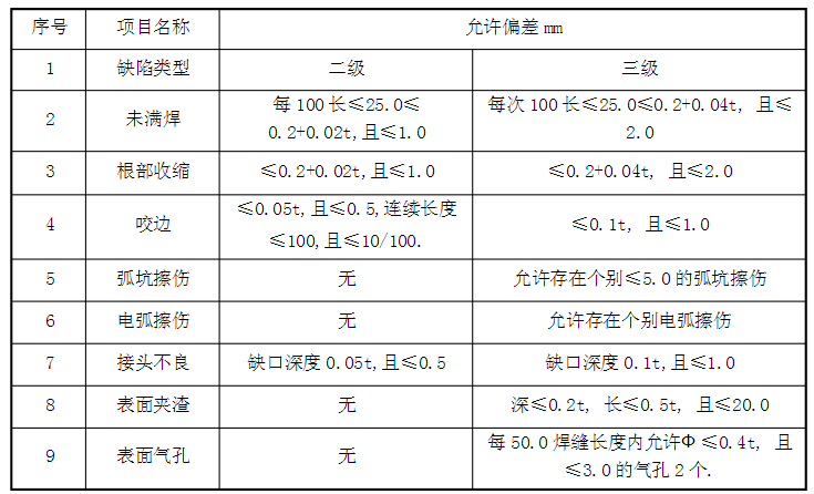 5、鋼結(jié)構(gòu)焊接:焊條、焊絲、焊劑等焊接材料與母材的匹配應(yīng)符合設(shè)計要求及現(xiàn)行行業(yè).標(biāo)準(zhǔn).《建筑鋼結(jié)構(gòu)焊接技術(shù)規(guī)程》JGJ81 的規(guī)定,焊條、焊絲、焊劑在使用前按其說明書及焊接工藝的規(guī)定進行烘焙和存放。焊工須持證上崗,在其認(rèn)可范圍內(nèi)施焊,焊接時采用合理的焊接工藝,以減少由焊接產(chǎn)生的變形和應(yīng)力,確保焊縫和構(gòu)件的質(zhì)量。本工程零部件連接處均需滿焊,焊縫厚度按設(shè)計要求,焊接時,盡量減少接縫數(shù)量,拼接應(yīng)按等強度連接原則,選擇合適的焊接工藝和剖口形式,并設(shè)置在預(yù)應(yīng)力較小部位,焊縫表面不得有裂紋、焊瘤等缺陷,表面無氣孔、夾渣、弧坑、電弧擦傷等缺陷,焊縫不得有咬邊,未焊滿根部收縮等缺陷,力求做到外形均勻,成型較好,焊縫與焊縫,焊縫與基層過渡平滑,焊渣和飛濺物須清理干凈,二、三級焊縫處外觀質(zhì)量標(biāo)準(zhǔn)見下表: